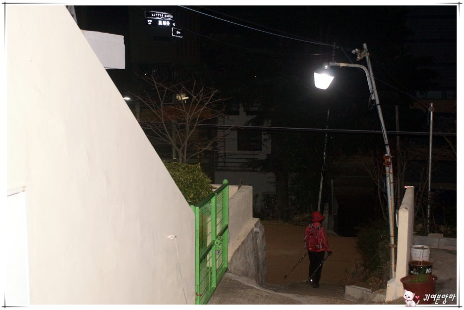 저기 전봇대 불빛 아래쪽에...안내판 같은것이 보입니다.