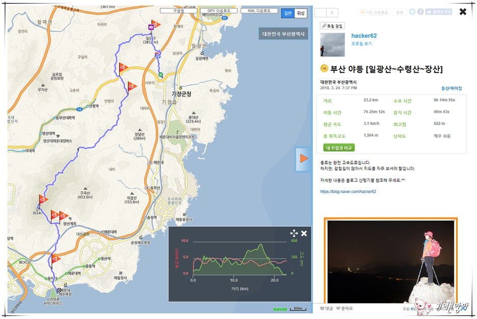 [부산] -일광산~장산(夜등)- ...거리 및 고도표