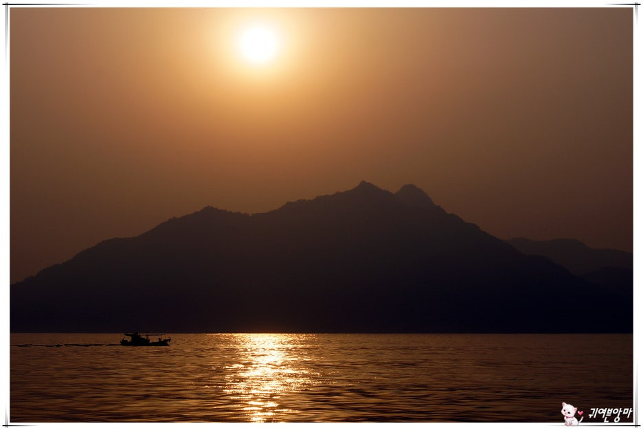 사량도의 산그림자 앞을 여유롭게 지나가는 고깃배 한 척...정말 한폭의 그림 같습니다.^^