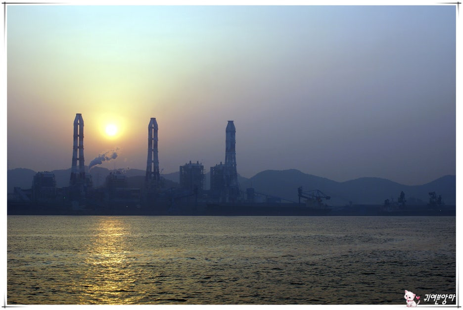 일신호가 사량도로 향하는 도중에...삼천포 화력발전소 뒤쪽으로 붉은 해가 솟아 올라오네요.