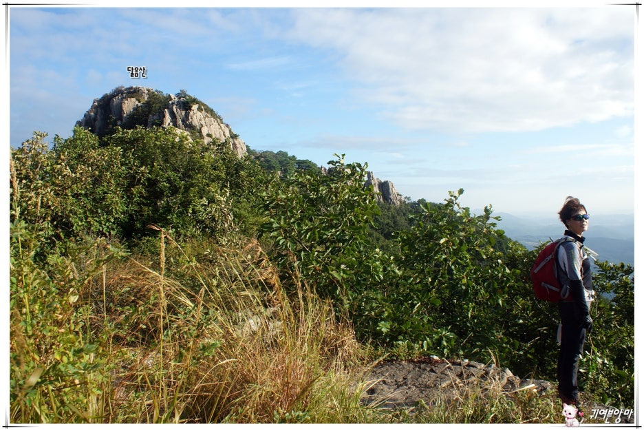 저만치 달음산 정상 암봉이 올려다 보이는...바위 조망터에 올랐네요.