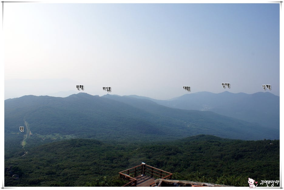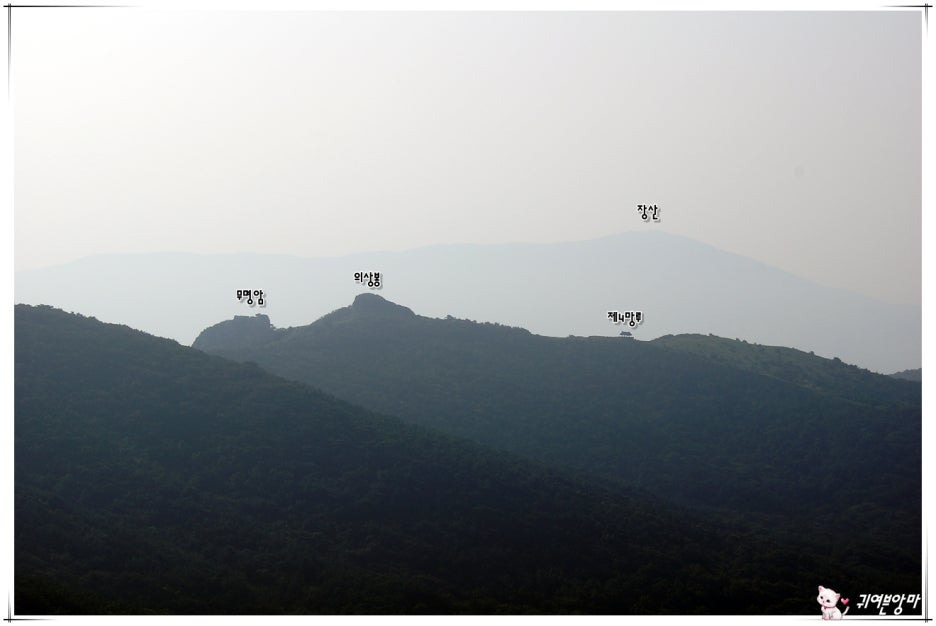 의상봉을 가운데 두고 무명암과 제4망루가 양쪽에 보이고...멀리 희미하게 장산도 보이네요.