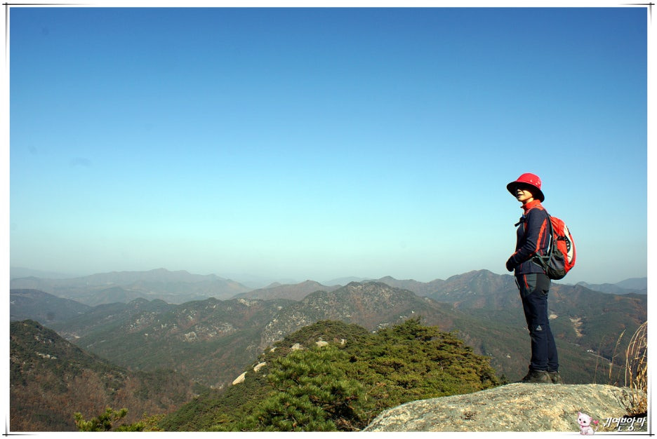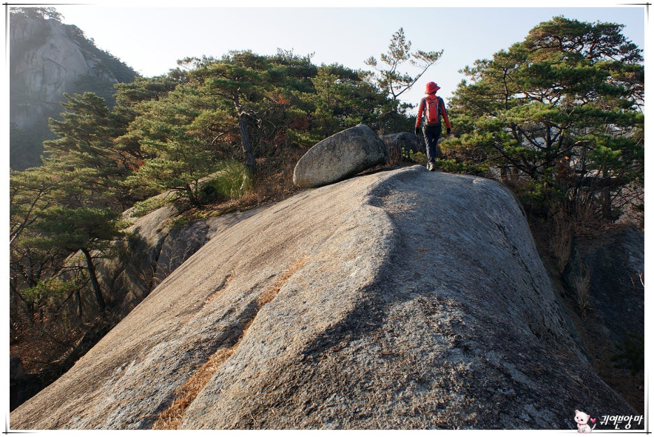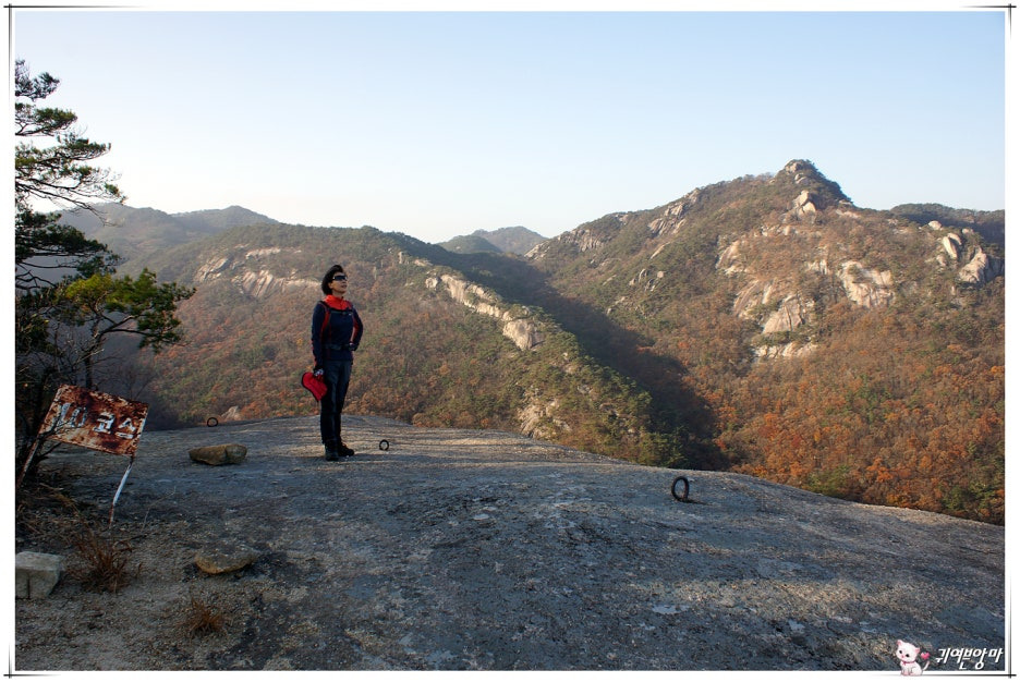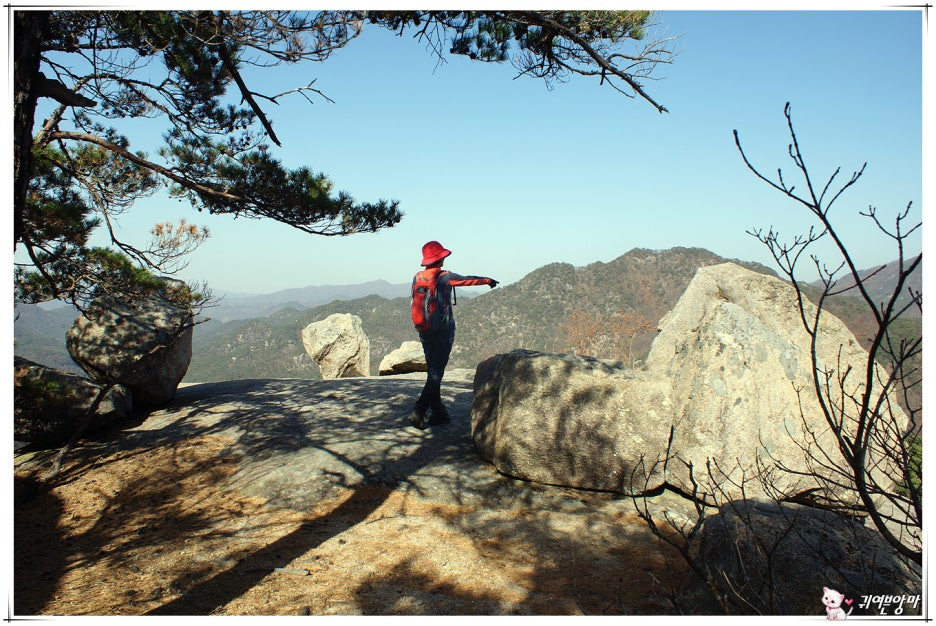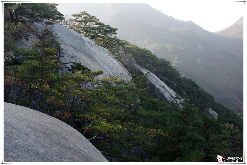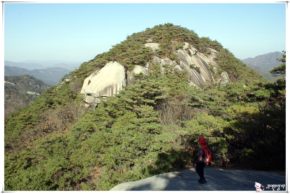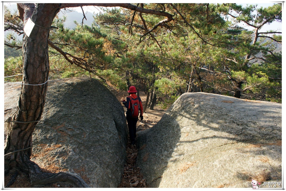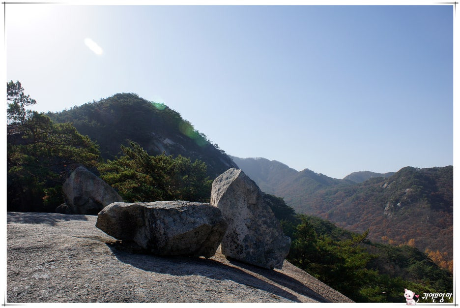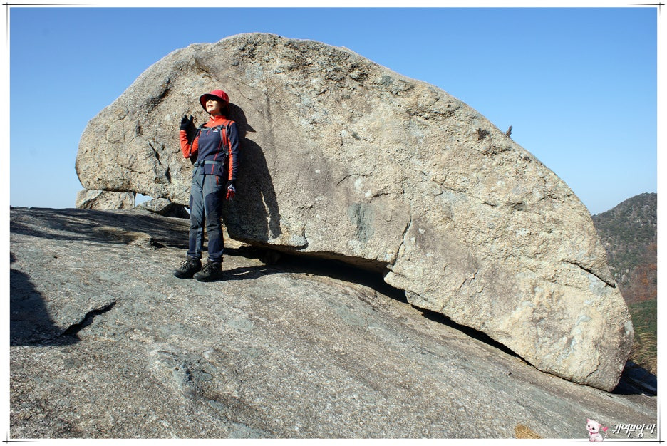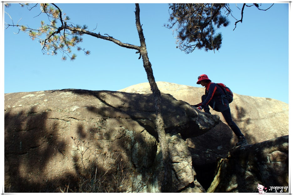 빙그레 웃고있는 복스런 돼지바위를 만나 뾰쪽한 코를 사뿐히 즈려밟고...둘로 쪼개진 거대한 바위위로 올라갔습니다.