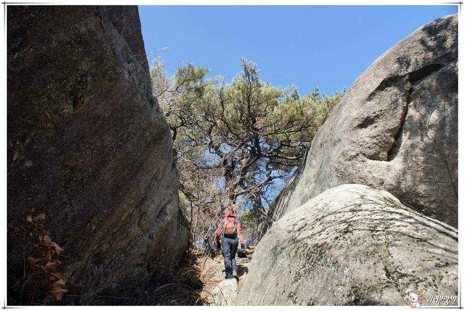 밧줄잡고 오르는 군인들의 훈련모습을 떠올리며...등로를 가로막는 커다란 바위 사잇길을 돌아서 올라갔더니....