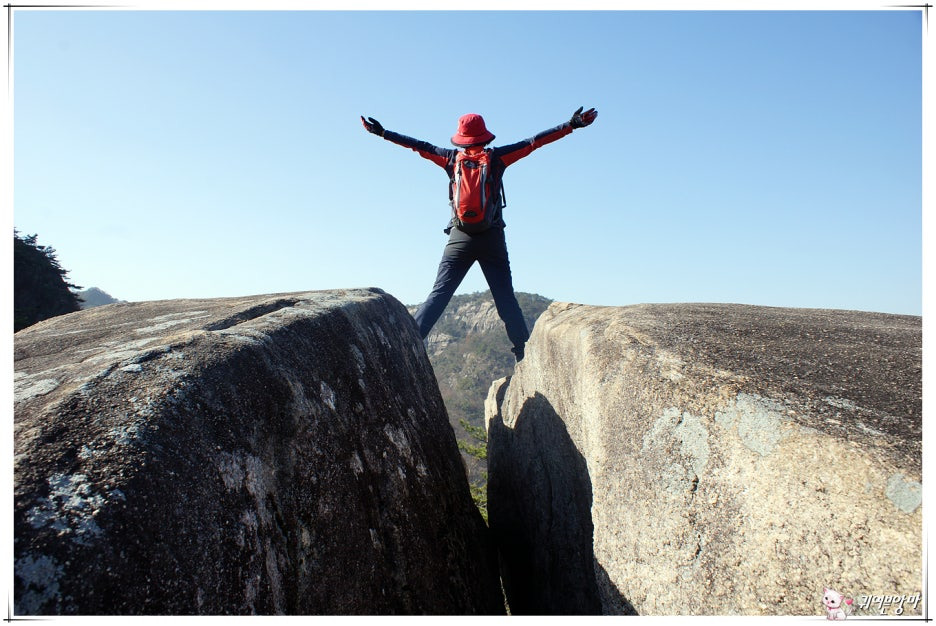 아래가 아찔하게 내려다 보이는 쪼개진 바위에 올라타고...기분좋은 산행길을 자축했네요.^^