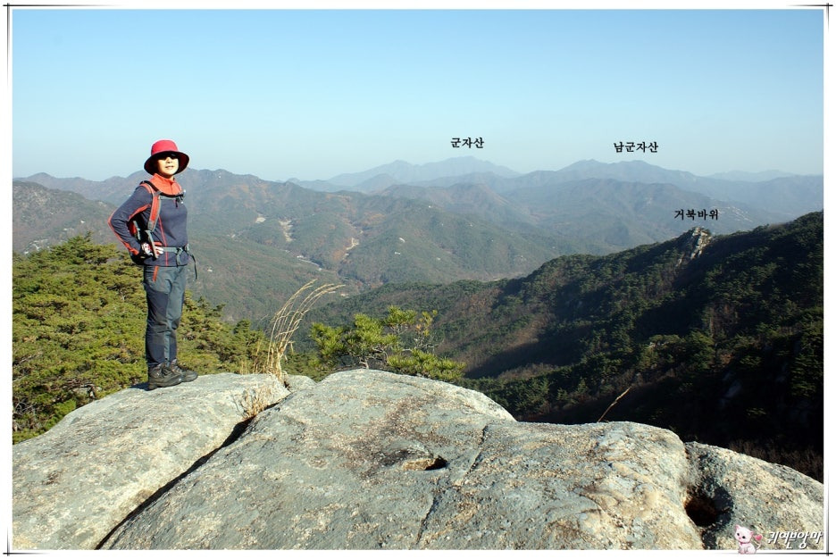 몸을 돌려 능선 오른쪽을 둘러보니...가령산 거북바위와 멀리 군자산도 분명하게 눈에 들어옵니다.