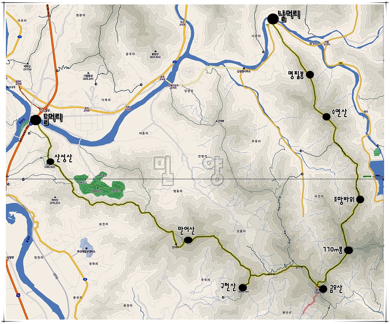 산행 들머리인 살내마을 앞 밀양강으로 흘러들면서...약 40여km의 물길은 끝이나네요.