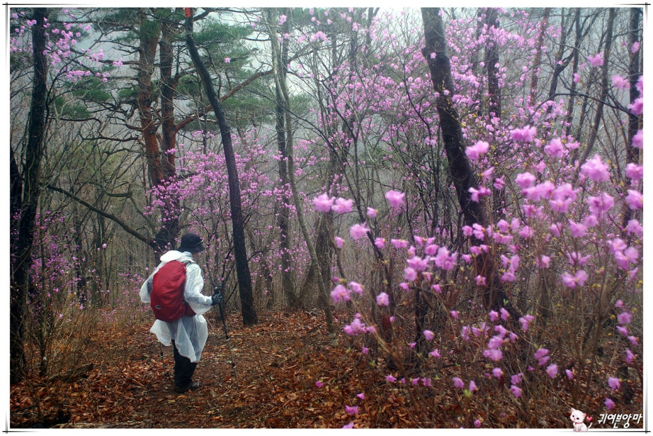 빗물 머금어 고개 떨군...진달래들의 배웅을 받으며 빠르게 하산합니다.