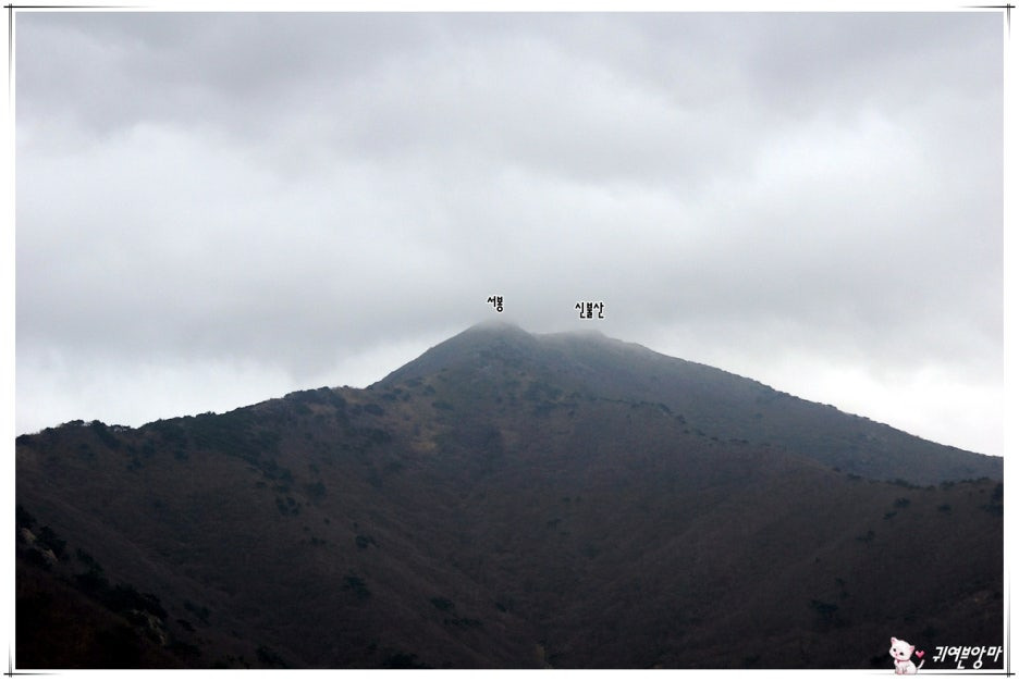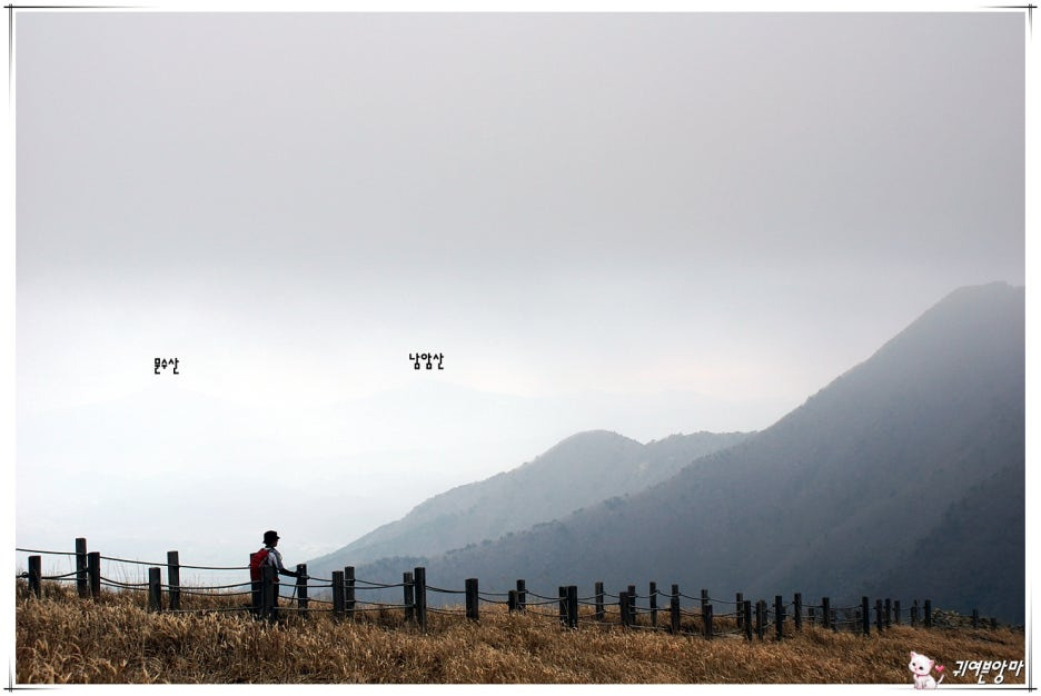 뒷쪽으로 고개 돌려보면...신불산과 햇실 내려앉은 영축산이 올려다 보이네요.