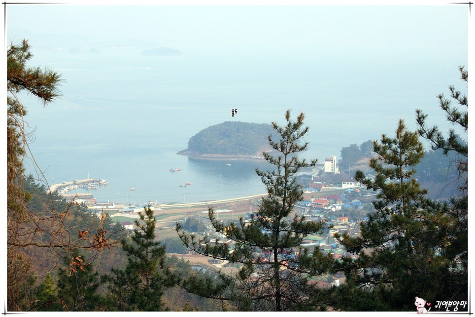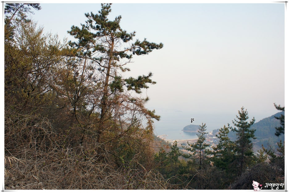 속금산 오름길에...오른쪽으로 율도가 빼꼼이 내려다 보입니다.
