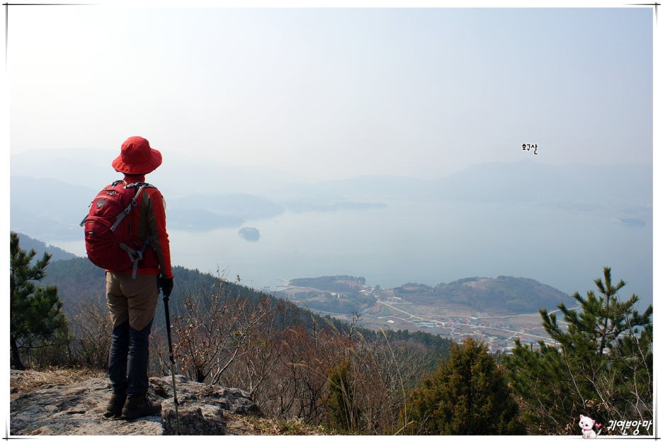 5분여만에 작은 봉우리에 올라섰더니...멀리 적량 앞바다가 내려다 보이네요.