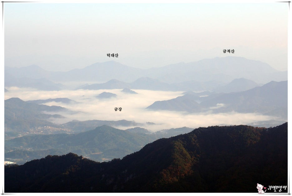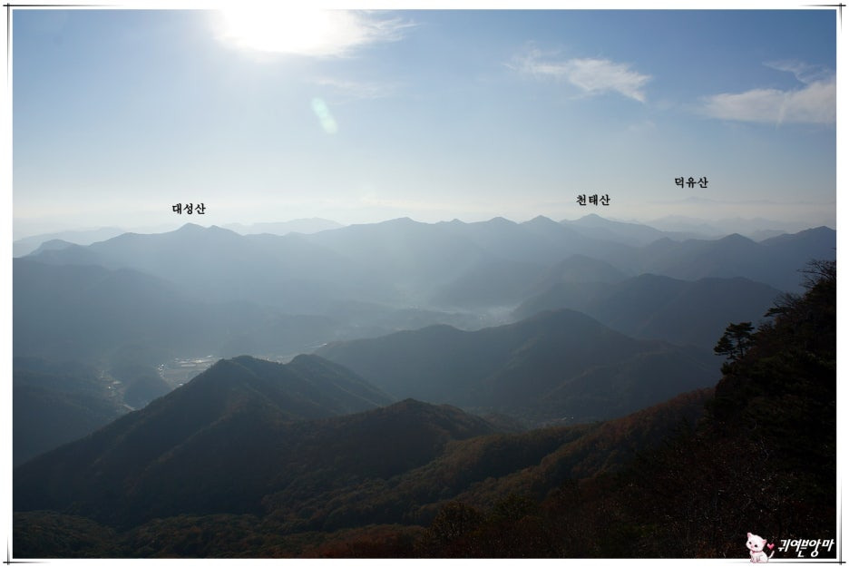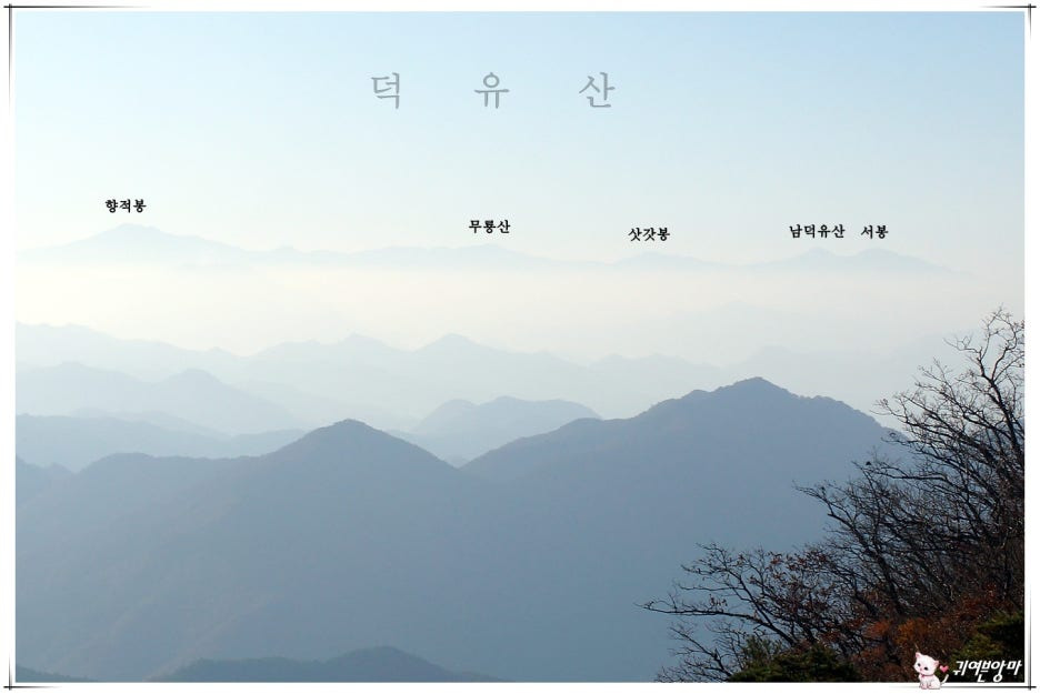 너울거리는 산 그리메 멀리엔...덕유산의 여러 봉우리들도 흐릿하게 눈에 들어오네요.