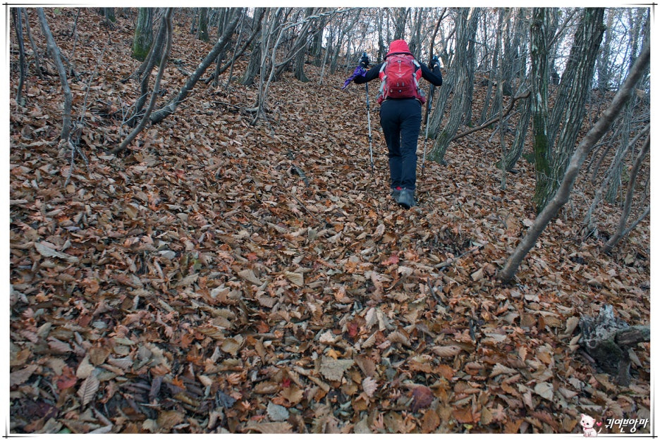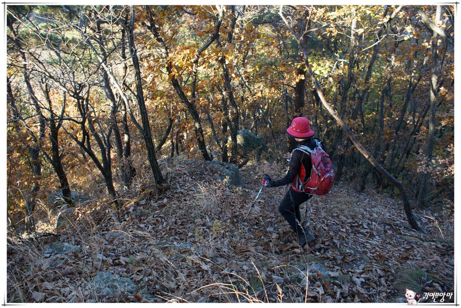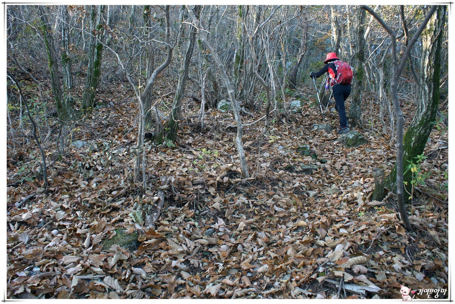 낙엽 수북한 국사봉 가파른 내림길을...두 발로 낙엽 쓸어내리며 아래쪽 고갯마루로 조심스럽게 내려가서....