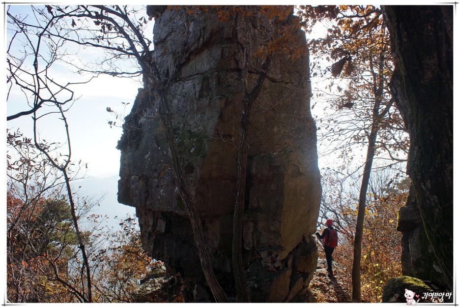 뾰쪽한 비석바위가 있는 이 곳에서 완만하게 이어지던 능선길은 끊어지고...능선 끝에 올라서면 까마득한 바위 낭떠러지입니다.