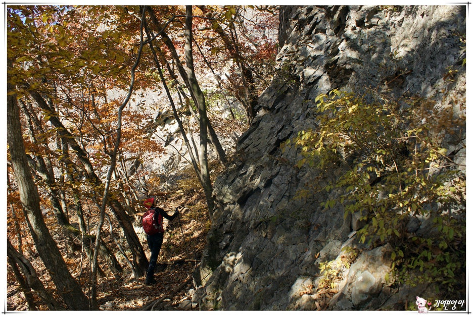 잠시 후, 까칠하고 가파른 바윗길로 변하더니...어느순간 까마득히 높은 바위 절벽이 되어 발길을 막아서네요.