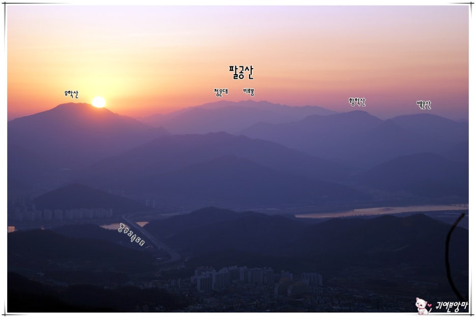 유학산과 그 옆으로...팔공산의 여러 봉우리들이 햇살에 붉게 타오르고 있습니다.