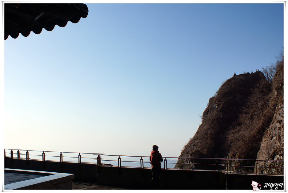 오른쪽으로 약사암 범종각이 보이고....머리 위쪽엔 돌탑들이 뾰쪽한 암봉이 보이네요.
