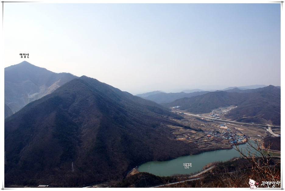 아래쪽으로 보이는 남북저수지는...짙은 초록물빛이 신비롭기만 하네요.