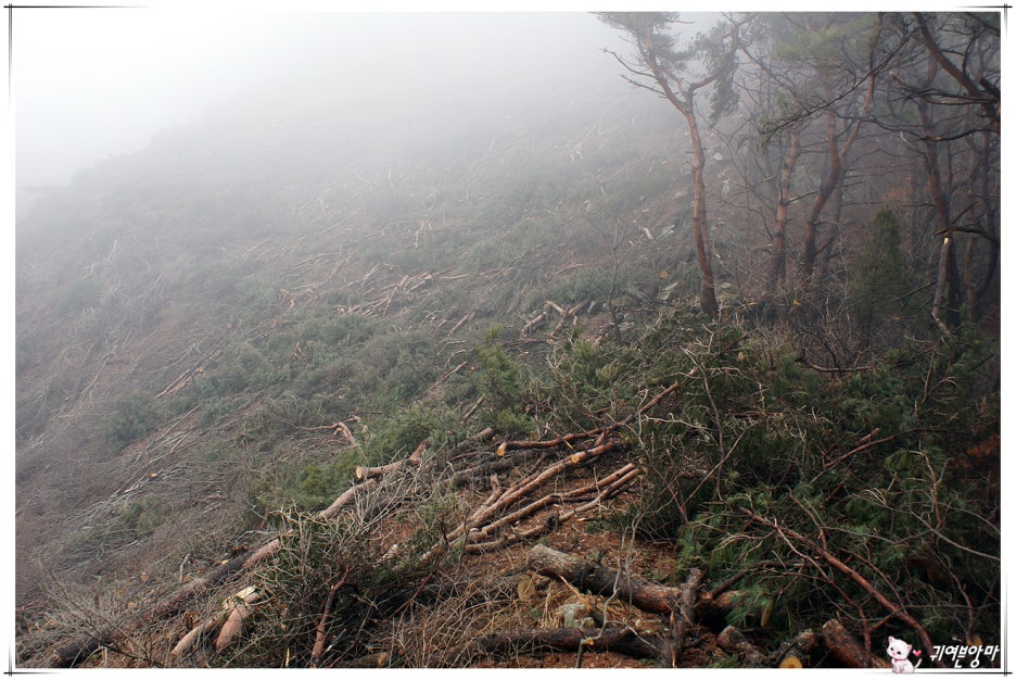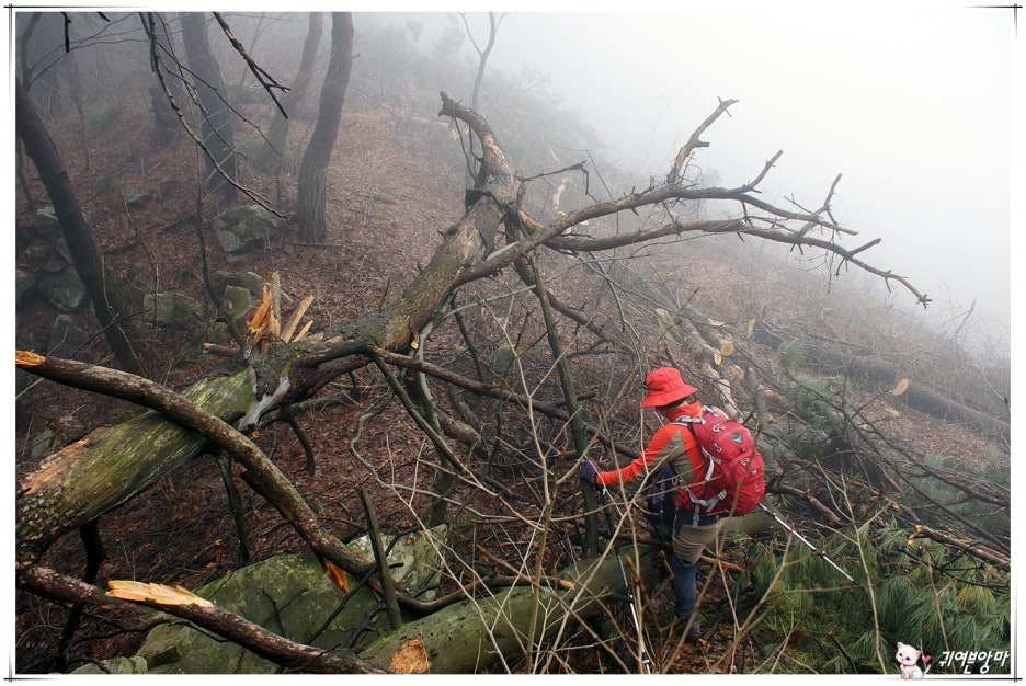 쓰러져 있는 나무들을 이리저리 피해서 진행하느라...걸음은 점점 느려지기만 하고....