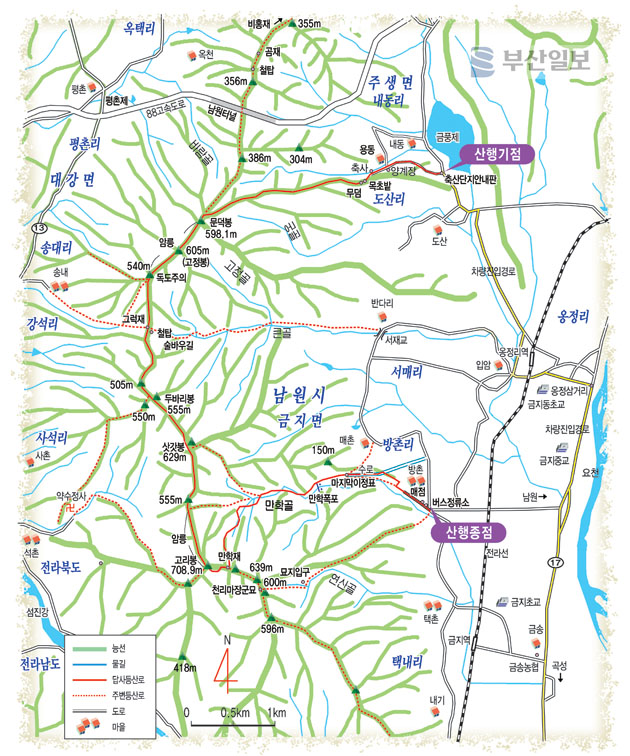 산행 들머리인 혼불문학관에서 부터 이곳까지 걸어온...능선길 안내판도 세워져 있고....