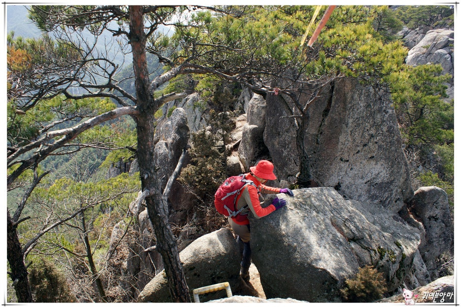 방금 내려온 암봉 오른쪽 아래로...길게 늘어뜨려져 있는 밧줄도 보이네요.