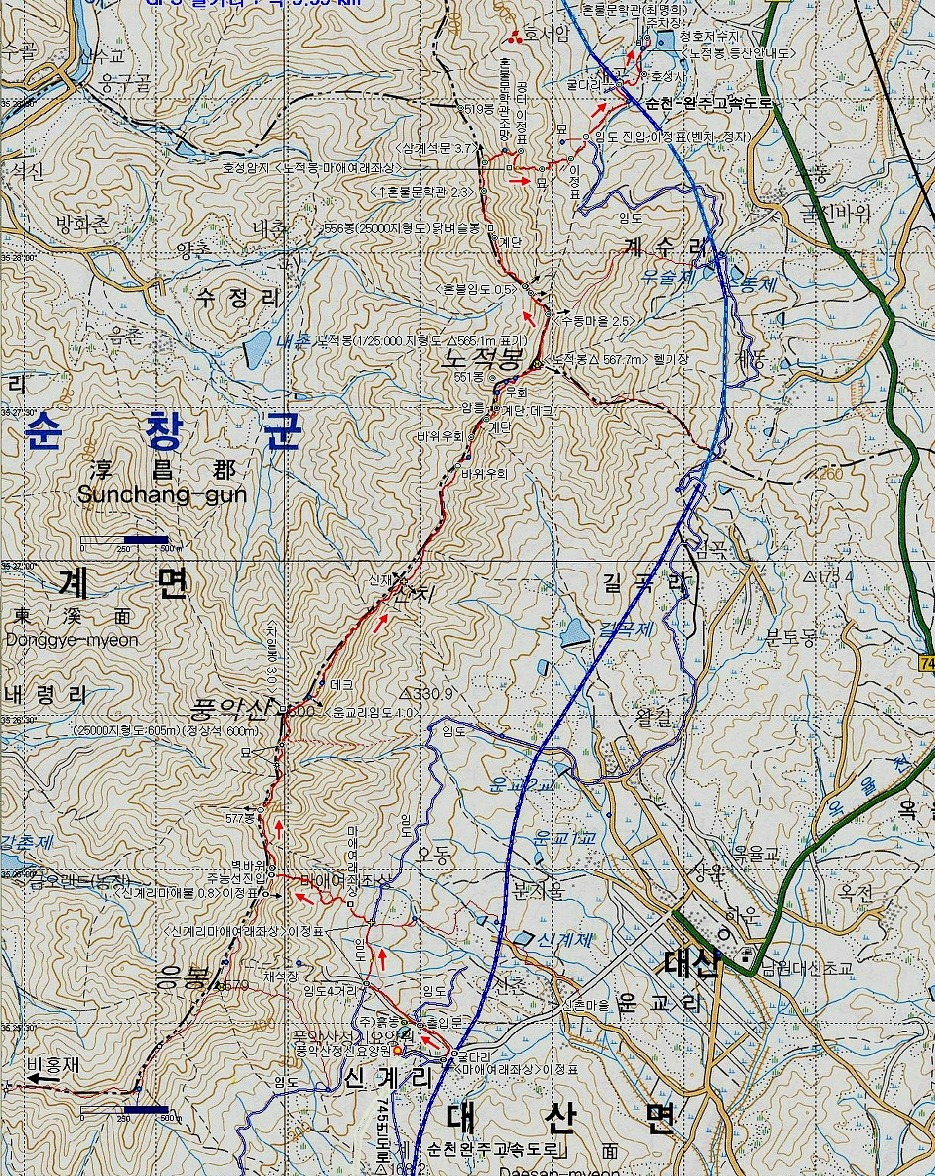 잠시 후, 지나갈 고리봉 하산 능선길인데...약 5km의 거리와 난이도를 계산해 봤네요.