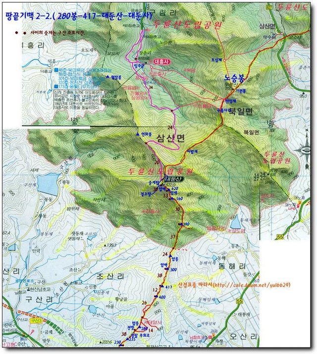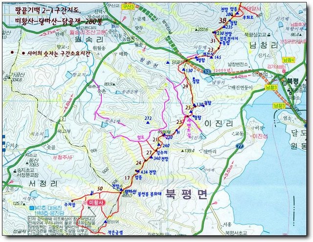 지도를 꺼내 살펴보니...등로를 벗어나도 한참을(약 800m) 벗어났더군요.