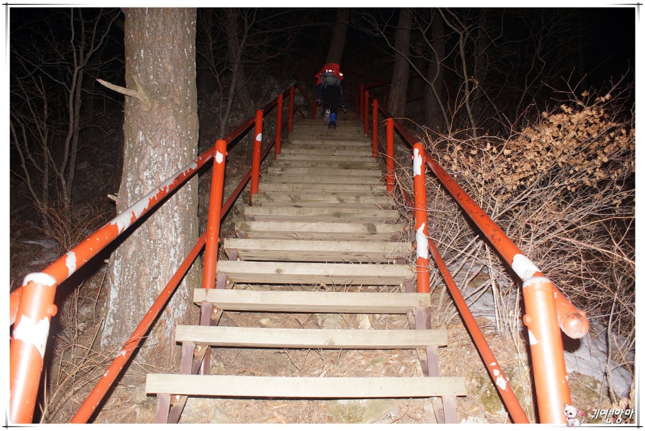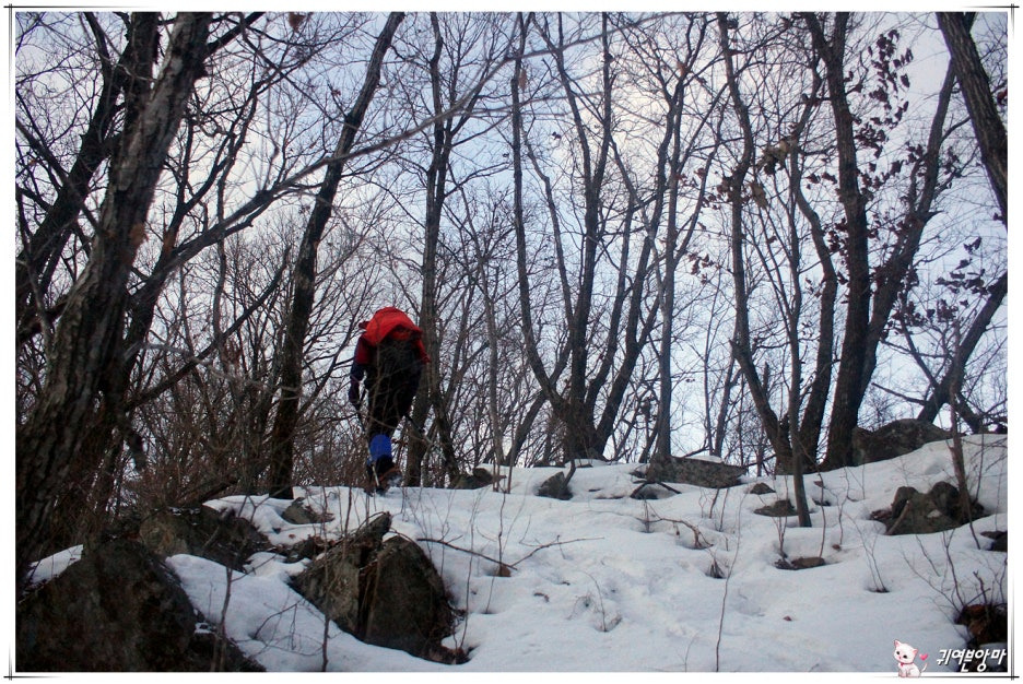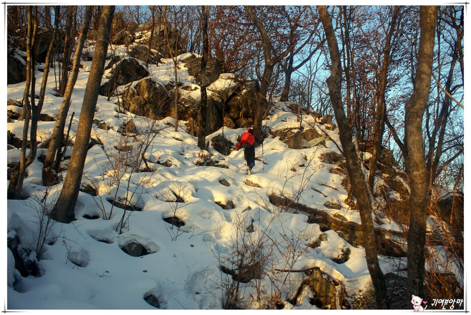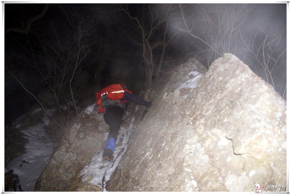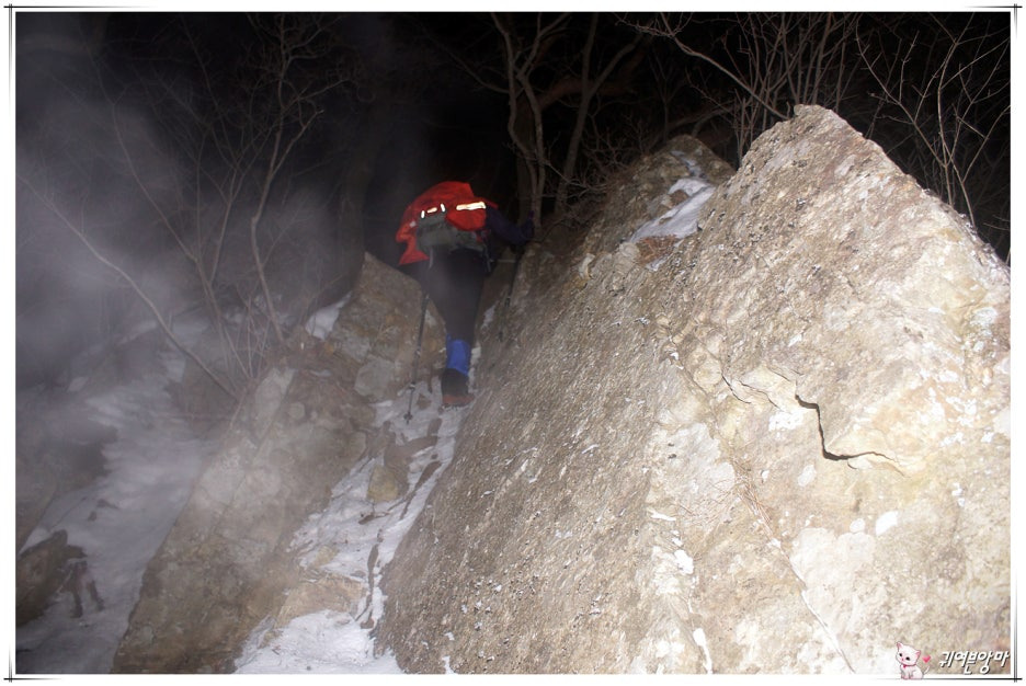 지금도 가파르게 보이지만...그 땐 많은눈에 꽁꽁 얼어붙어 있어서 잡고오를수 있을만한 것이 없더군요.