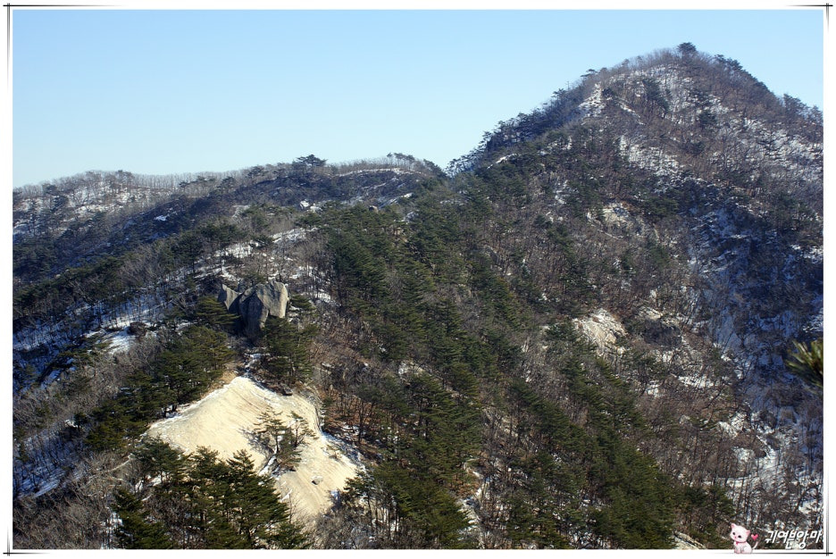 그 뒤쪽 멀리에 하얀 바위 봉우리는...흰 대머리산 희양산이구요.^^