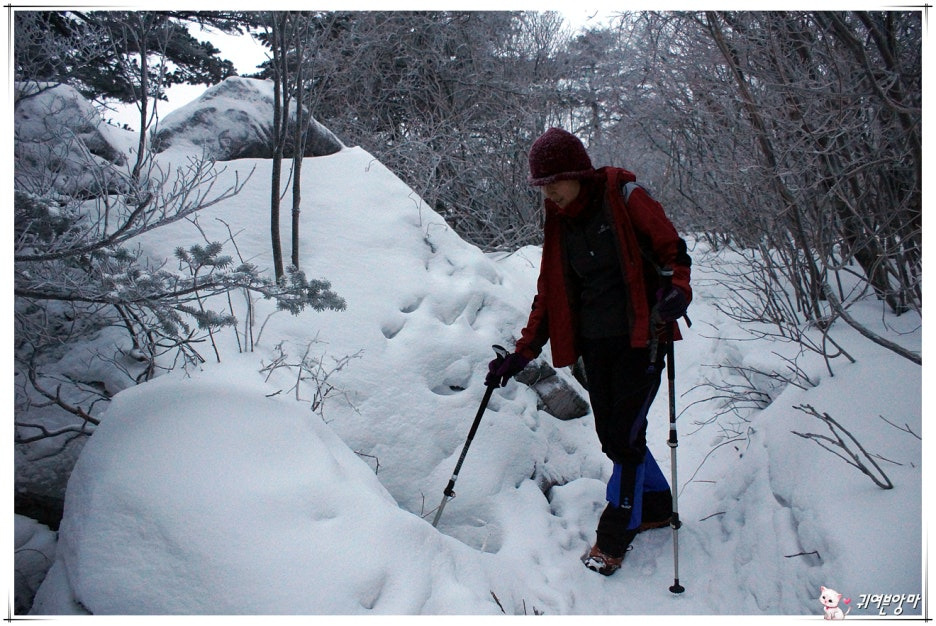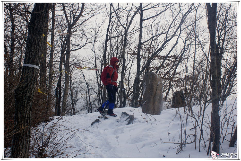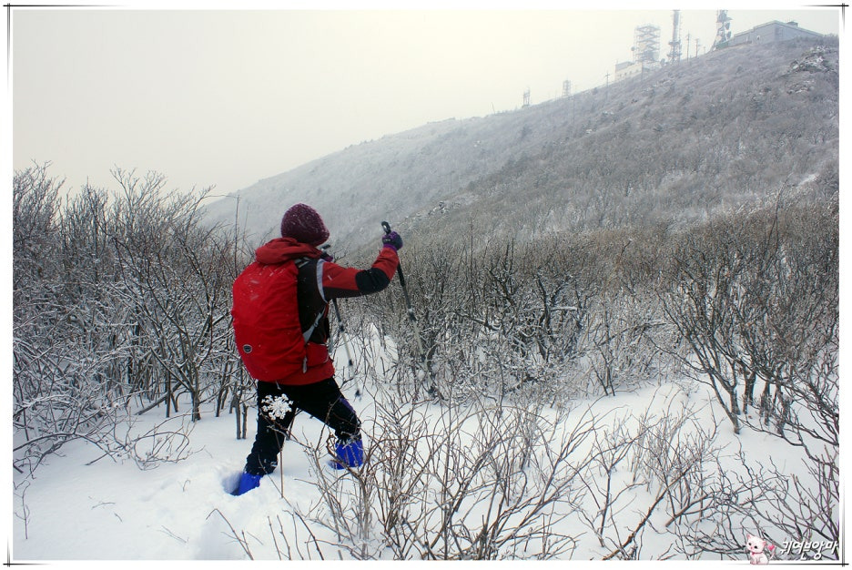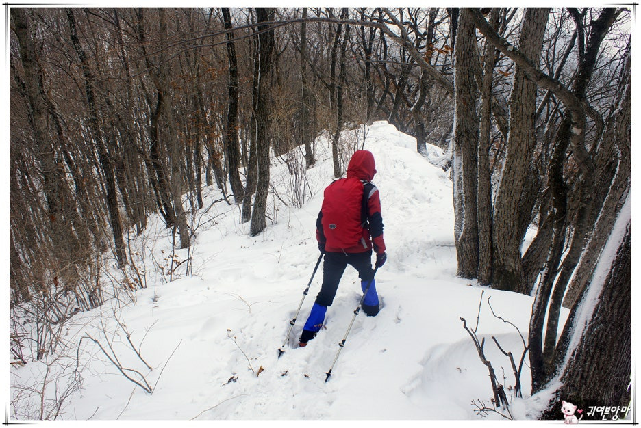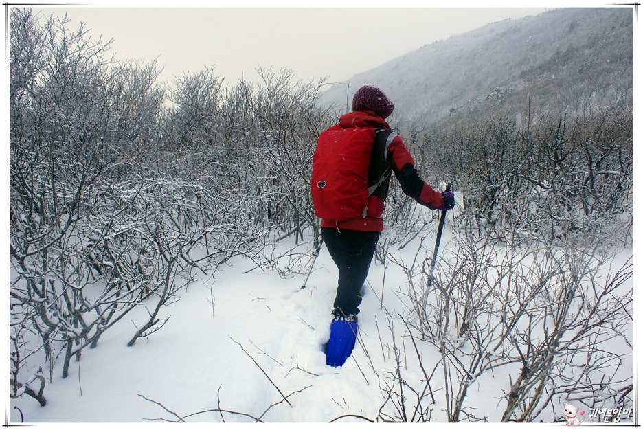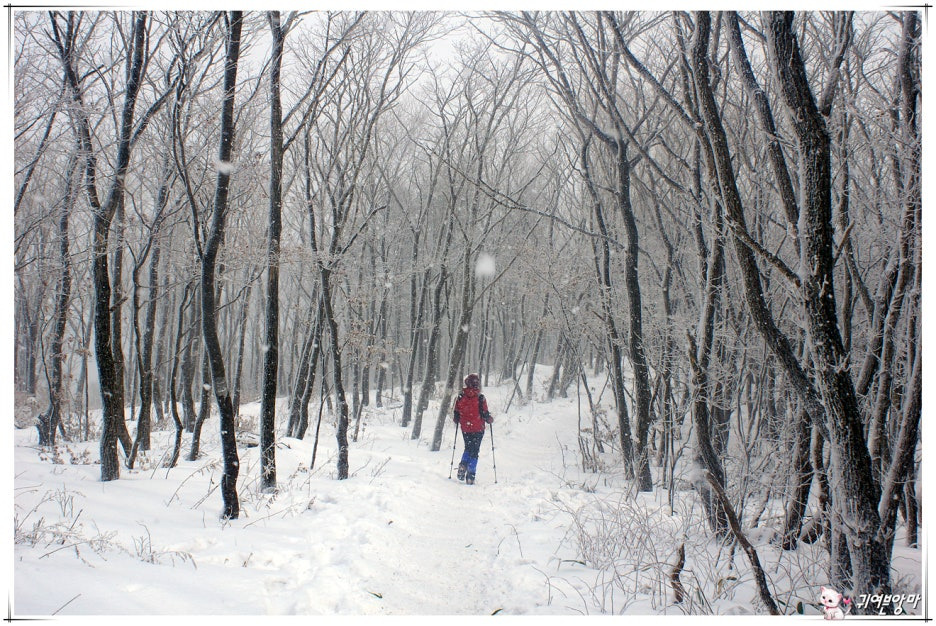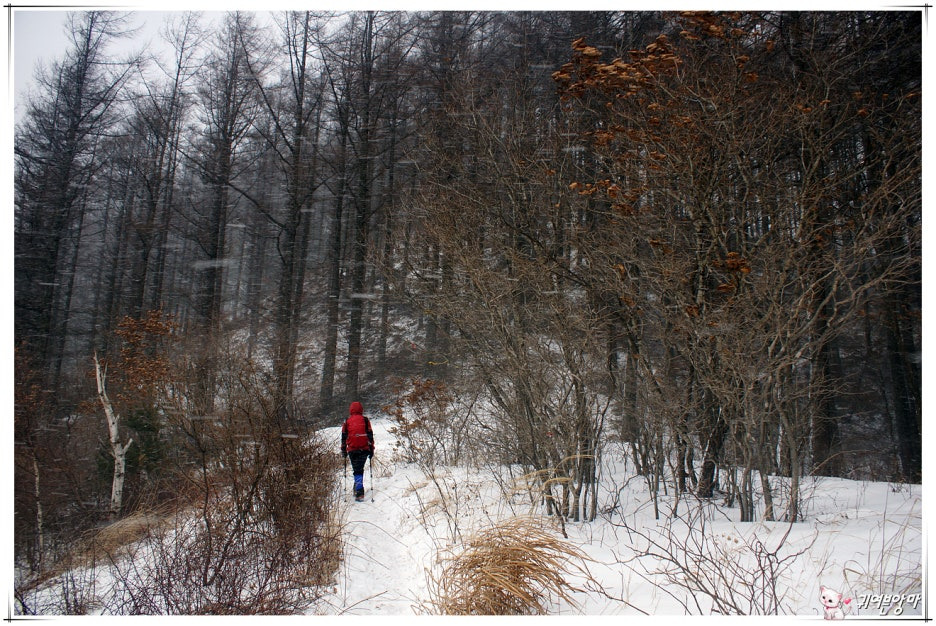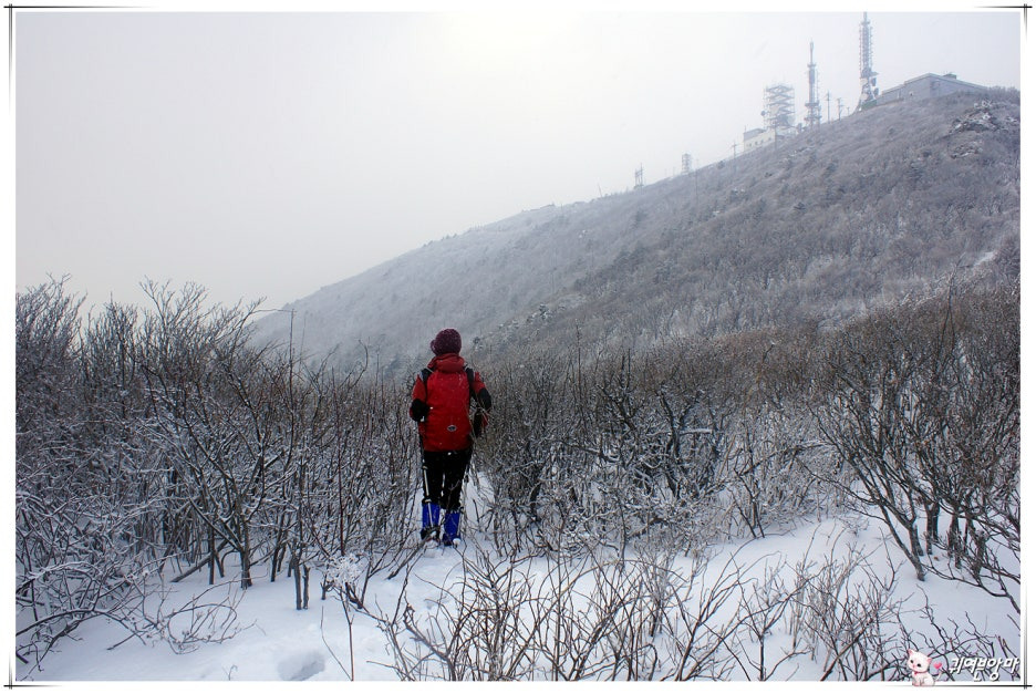 kbs중계소를 돌아서 내려서는데 등로는 뚜렷하나...곳곳에 무릅까지 빠질 정도로 눈이 많이 쌓여있더군요.