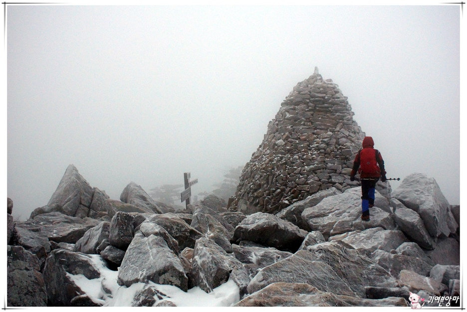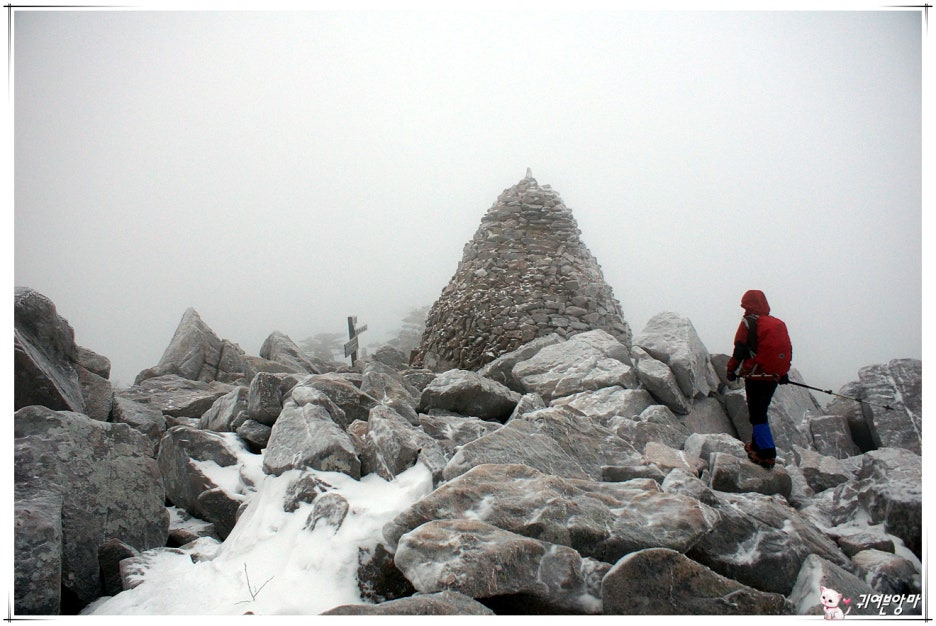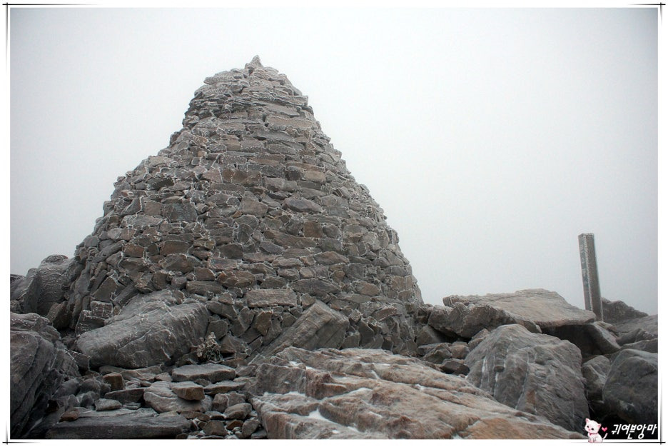 얼어붙은 돌탑 뒤쪽에...문수봉 정상을 알려주는 정상목이 저기에....ㅋ
