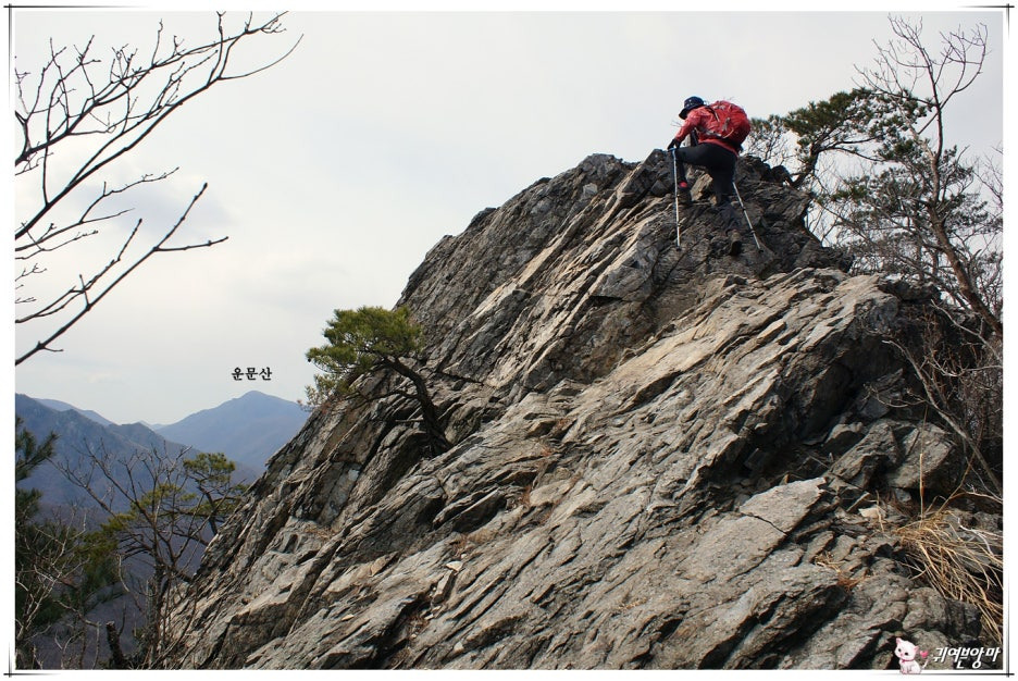 바람을 피해서 바위틈에 숨어들고...우린 쌍두2봉이 자리한 암봉으로 서둘러 올라갔네요.