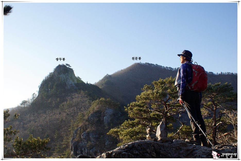 쌍두2봉 바위 정상에 올라갔더니...맞은편에 쌍두봉이 뾰쪽하게 올려다 보이고....