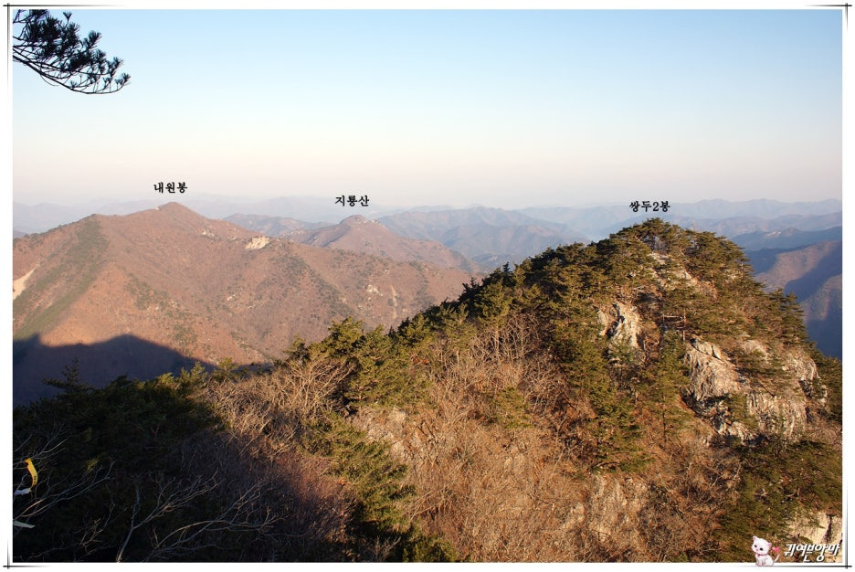 지나온 바윗길 아래에 쌍두2봉이 오똑하고...처음에 오르려했던 내원봉과 지룡산이 능선 뒤쪽으로 보입니다.