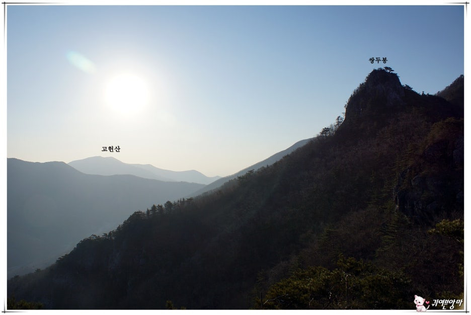쌍두봉에서 흘러내리는 능선 왼쪽에는...고헌산이 햇살아래 눈부시고....