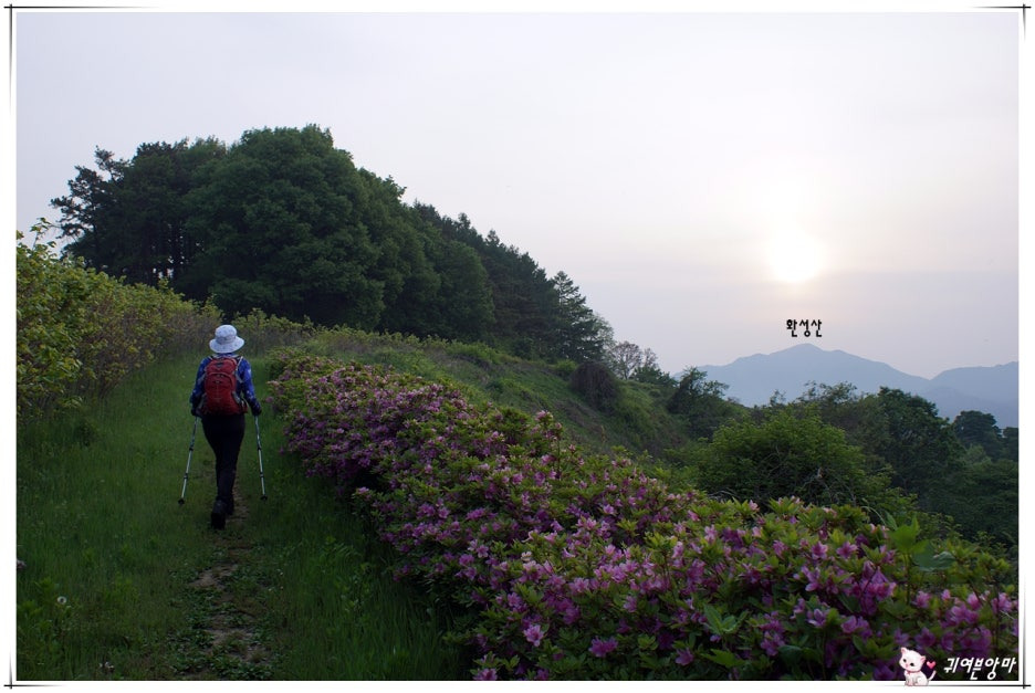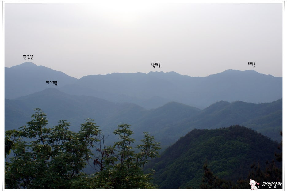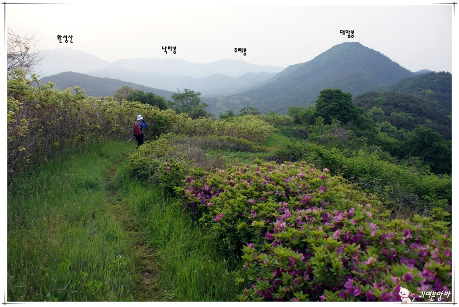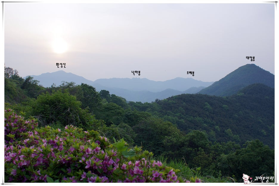 꽃길 능선 뒤쪽 흐릿한 햇살아래 환성산과 낙타봉...그리고, 초례봉이 눈에 들어옵니다.