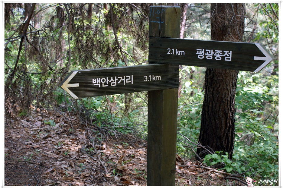 돼지코를 몇걸음 지나친 능선 아래쪽에서...백암삼거리를 가르키는 왼쪽의 등로를 따라갔습니다.